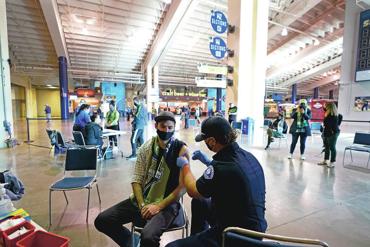 In this May 2 photo, Austin Kennedy, left, a Seattle Sounders season ticket holder, gets the Johnson & Johnson COVID-19 vaccine at a clinic in a concourse at Lumen Field prior to an MLS soccer match between the Sounders and the Los Angeles Galaxy. (AP Photo/Ted S. Warren, File)