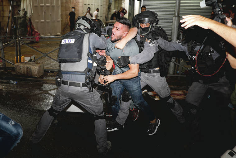 JERUSALEM — Israeli police faced off with Palestinian protesters Sunday in another night of clashes in east Jerusalem, a day before Israeli nationalists planned to parade through the Old City in an annual flag-waving display meant to cement Israeli claims to the contested area.