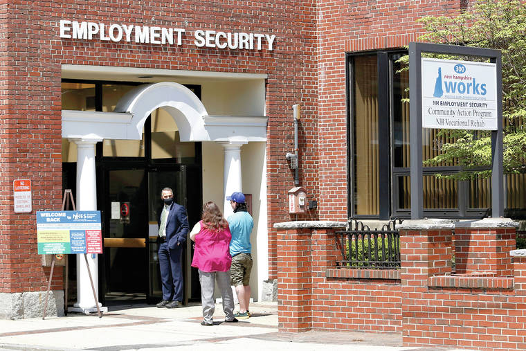 Job seekers line up outside the New Hampshire Works employment security job center, Monday, May 10, 2021, in Manchester, N.H. States are pushing the unemployed to get back to work to help businesses large and small find the workers they need to emerge from the COVID-19 recession. Now some states are reinstating a requirement that anyone who collects unemployment must look for work. (AP Photo/Mary Schwalm)