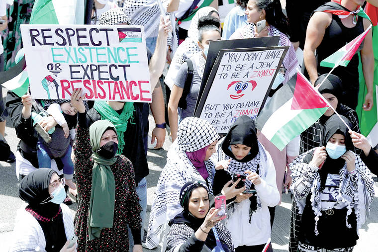 Protesters supporting Palestinians walk down Michigan Ave., as President Joe Biden visits a Ford electric vehicle center nearby, Tuesday, May 18, 2021, in Dearborn, Mich. Biden’s efforts to spotlight his big infrastructure plans are suddenly being overshadowed by the escalating violence between Israel and the Palestinians. (AP Photo/Carlos Osorio)