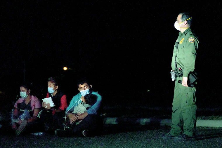 In this March 24, 2021 photo, a migrant man, center, holds a child as he looks at a U.S. Customs and Border Protection agent at an intake area after crossing the U.S.-Mexico border, early Wednesday, March 24, 2021, in Roma, Texas. The Biden administration said Monday that four families that were separated at the Mexico border during Donald Trump’s presidency will be reunited in the United States this week in what Homeland Security Secretary Alejandro Mayorkas calls “just the beginning” of a broader effort. (AP Photo/Julio Cortez)