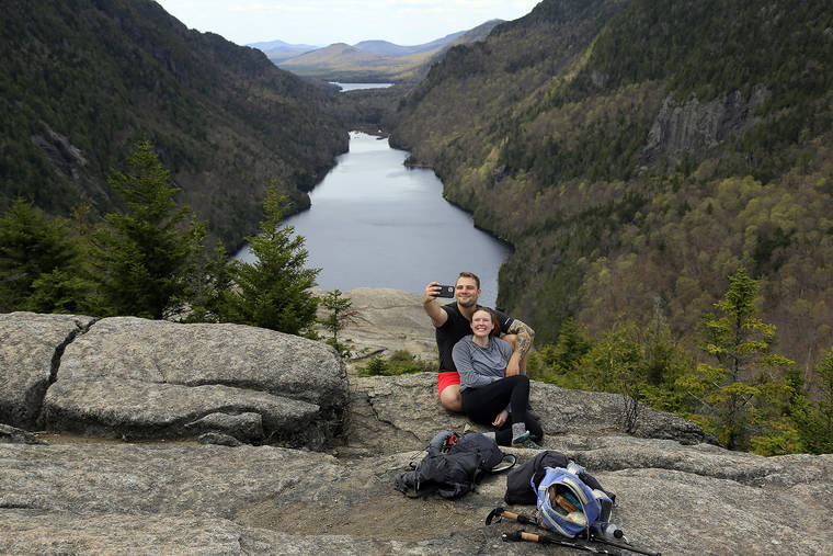 Sidney Gleason, right, and Joe Gorsuch, both of Syracuse, take a selfie while taking a break at Indian Head summit inside the Adirondack Mountain Reserve on May 15 near St. Huberts, N.Y. (AP Photo/Julie Jacobson)