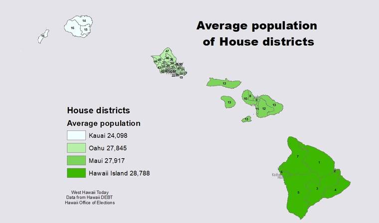 The Big Island has grown the fastest and has the most-populated average House districts in the state, with 28,788 residents estimated in each of its seven districts. Maui comes next, with 27,917 estimated in each of its six districts. And Kauai’s three districts show an estimated average population of 24,098.