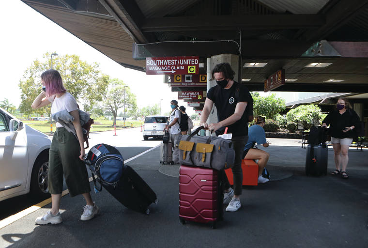 Kelsey Walling/Tribune-Herald People wait for rides after arriving at the Hilo International Airport in Hilo on Monday, May 17, 2021.