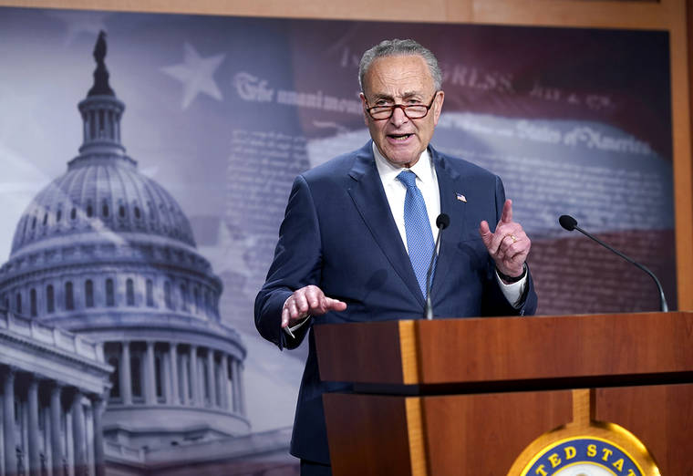 Senate Majority Leader Chuck Schumer, D-N.Y., speaks to reporters Friday after final votes going into the Memorial Day recess at the Capitol in Washington. (AP Photo/J. Scott Applewhite)