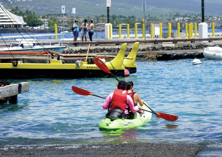 Visitors launch a rental kayak into Kailua Bay on May 21. (CHELSEA JENSEN/West Hawaii Today)