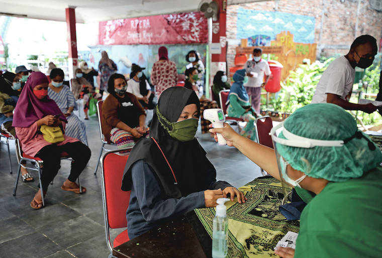 A woman has her temperature checked before receiving a shot of the AstraZeneca vaccine during a mass coronavirus vaccination clinic Tuesday in Jakarta, Indonesia. (AP Photo/Dita Alangkara)