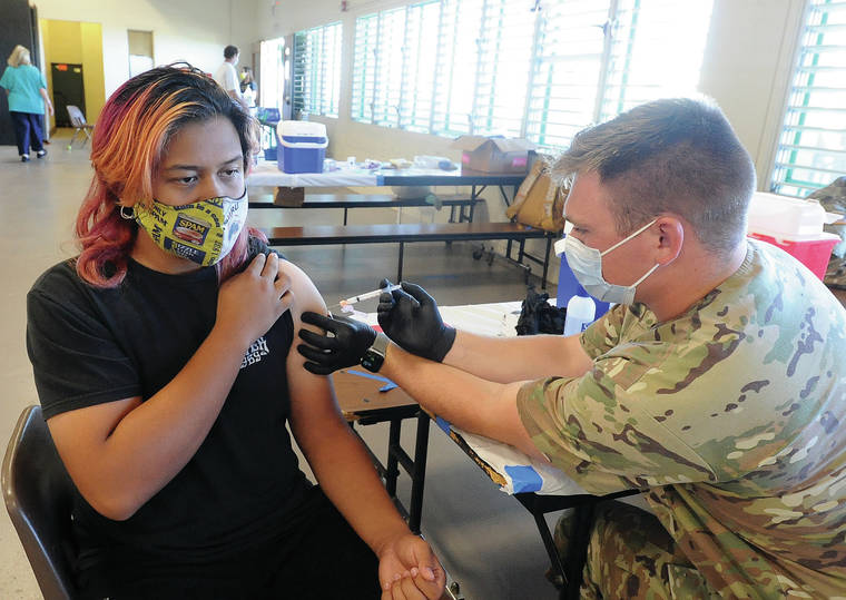 Jacob Agard receives his second vaccination dose from National Guard medic Zion Norem Saturday at Kealakehe Intermediate School. (Laura Ruminski/West Hawaii Today)