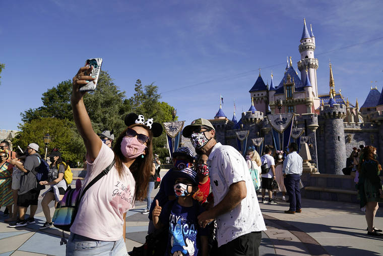In this April 30 file photo, a family takes a photo in front of Sleeping Beauty's Castle at Disneyland in Anaheim, Calif. (AP Photo/Jae Hong, File)
