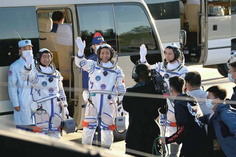 JIUQUAN, China — China launched the first three crew members on a mission to its new space station Thursday in its first crewed mission in five years.