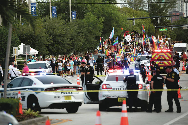Police and firefighters respond after a truck drove into a crowd of people during The Stonewall Pride Parade and Street Festival on Saturday in Wilton Manors, Fla. (Chris Day/South Florida Sun-Sentinel via AP)