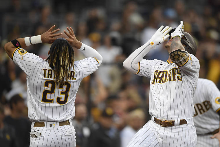 With the score tied at 3, Jake Cronenworth, who homered in the first, started the winning rally with a leadoff double off Blake Treinen (1-3) that went off the glove of leaping right fielder Matt Beaty. Machado, who also homered in the first, singled. Victor Gonzalez came on and allowed Eric Hosmer’s sacrifice bunt. Wil Myers was intentionally walked to load the bases before Gonzalez walked Grisham to bring in Cronenworth. Victor Caratini added a sacrifice fly.