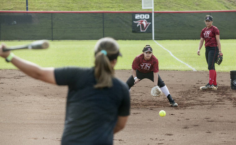 HOLLYN JOHNSON/Tribune-Herald Aisha Sueda – hitting balls to Vevesi Liilii during a drill – has worked in the background the past four seasons as a UH-Hilo softball assistant under Callen Perreira. Sueda jumped to the forefront of the Vuls’ braintrust Thursday after being named the seventh coach of the program