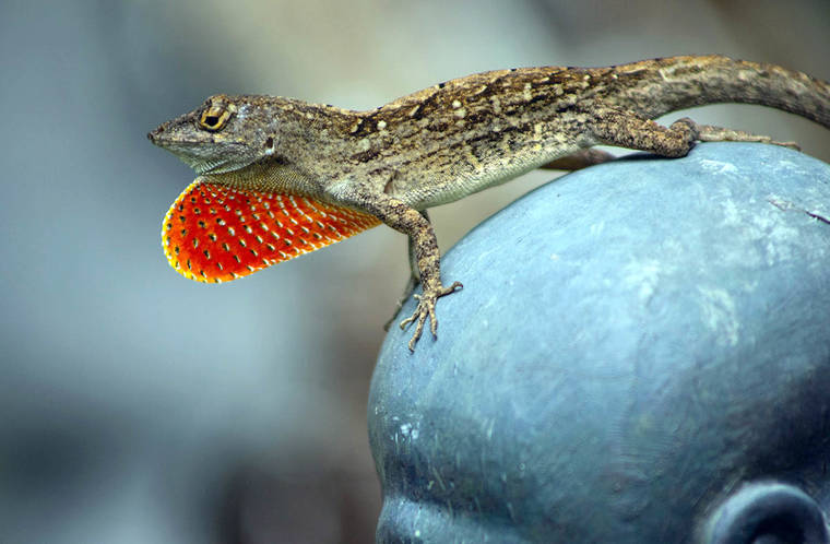 Hawaii’s garden recently became home to a new Anole. The one we have seen for years is called the American Chameleon because of its ability to change colors. The new guy is the Bahamian Anole that is dark brown with diamond markings on the back and a bright red dewlap of the male. There are others as well like the Cuban Anole on Oahu. We also have iguanas, at least eight species of gecko, skinks and at least two species of true Chameleon. We have one species of snake called the Island Blind Snake. However, none are native to Hawaii. In fact there are no native land lizards, snakes, frogs, toads or turtles. Some came as hitchhikers, stowaways and in the days when there were few laws, in the pet trade. Now it is illegal to bring in most of these types of animals. Most aforementioned are harmless or even beneficial, but can be a nuisance depending on ones attitude toward the environment. Local folks often think of geckos in the home are good luck, and almost everyone has a warm spot in their heart for the Geico Gecko!