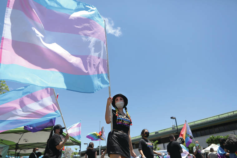 Shaira Martins waves the Transgender Pride Flag while celebrating Drive-Thru Pride in Hilo on Saturday, June 26, 2021. ▲