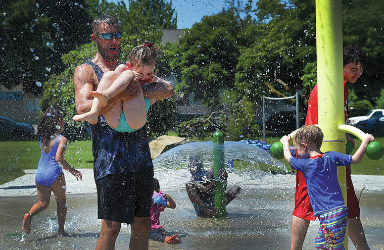 Kyle Hendershot gives his 7-year-old daughter Karmen a boost cooling off at the popular Woodruff Park Sprayground area Sunday in west Olympia, Wash. (Steve Bloom/The Olympian via AP)