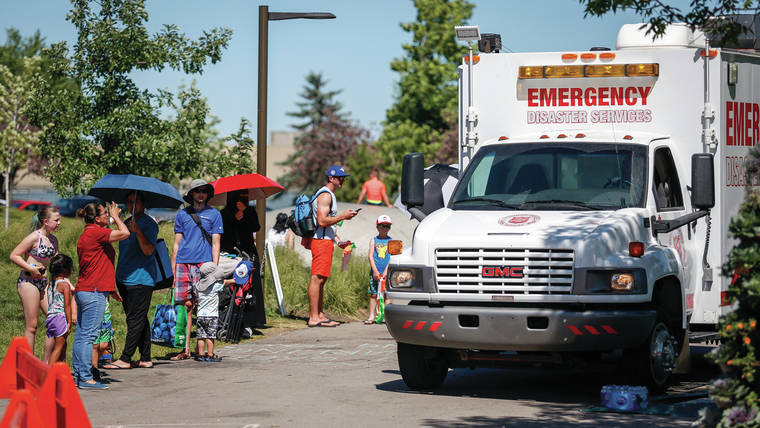 A Salvation Army EMS vehicle is setup as a cooling station as people lineup to get into a splash park while trying to beat the heat on Wednesday in Calgary, Alberta. (Jeff McIntosh/The Canadian Press via AP)