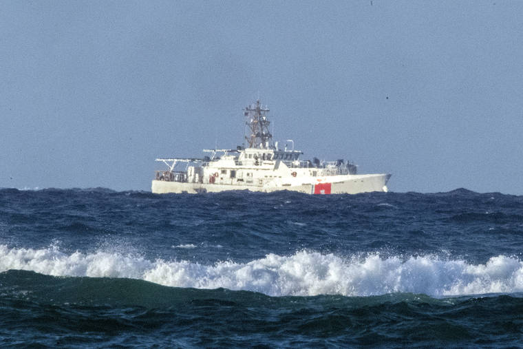 A U.S. Coast Guard cutter patrols the area of debris from a 737 cargo plane that crashed off Oahu on Friday, near Honolulu. (Craig T. Kojima/Honolulu Star-Advertiser via AP)
