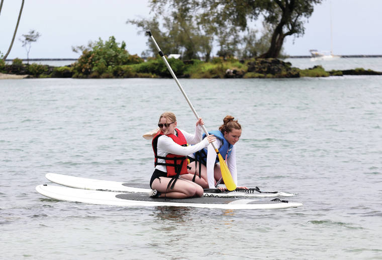 Kelsey Walling/Tribune-Herald Gracie, left, and Faith Holbrook work together to figure out how to stand up on their paddle boards in Reeds Bay in Hilo on Wednesday. The Holbrooks are visiting from North Carolina and wanted to try paddle boarding for the first time with a rental from Hilo Ocean Adventures.