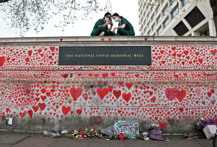 In this April 27 file photo, nurses from the nearby St Thomas' hospital sit atop the National Covid Memorial Wall in London. (AP Photo/Frank Augstein, File)