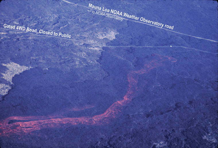 The next — and most recent — eruption in 1984 covered over 90% of the 1975 lava flows. However, flows are still exposed just south (mauka) of the Mauna Loa NOAA Weather Observatory road about 3.5 km (2.2 miles) before the observatory.