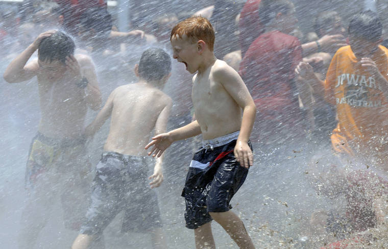 FILE - In this June 9, 2006, file photo, kids from a day camp get soaked by the the fire department at Tyler Junior College in Tyler, Texas. The U.S. has seen a string of COVID-19 outbreaks tied to summer camps in recent weeks in Texas, Illinois, Florida, Missouri and Kansas, offering what some fear could be a preview of the upcoming school year. (Brad Smith/Tyler Morning Telegraph via AP, File)