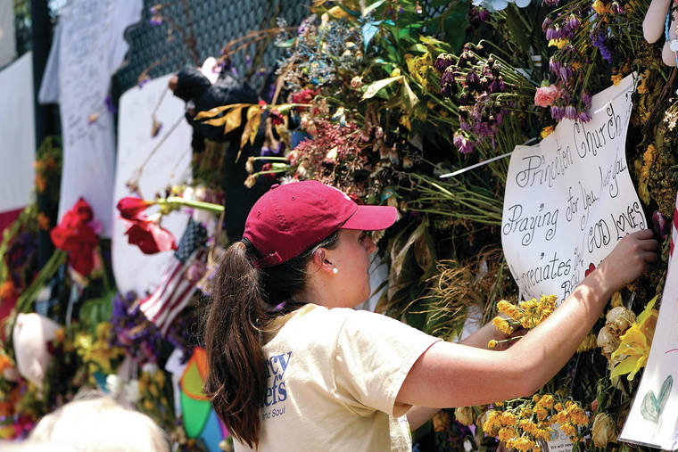 Molly MacDonald, with Mercy Chefs, hangs a sign on behalf of Princeton Church at a makeshift memorial remembering the victims of the nearby collapsed Champlain Towers South building Wednesday in Surfside, Fla. (AP Photo/Lynne Sladky)