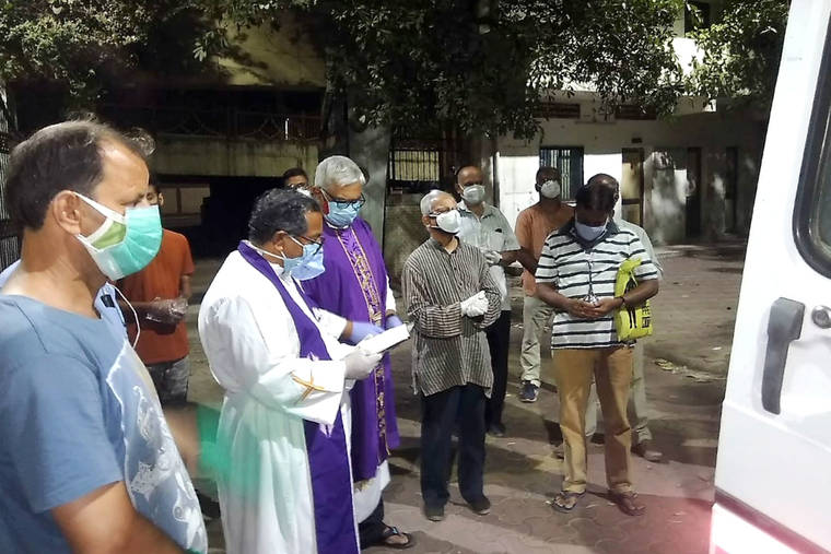 In this April 18, 2021, photo provided by the Rev. Cedric Prakash, priests pray over the body of the late Rev. Jerry Sequeira before his cremation in Ahmedabad, India. Sequeira is one of more than 500 Catholic priests and nuns who have died from COVID-19 in India according to the Rev. Suresh Mathew, a priest at Holy Redeemer’s Church in New Delhi and the editor of the church-run Indian Currents magazine. (Cedric Prakash via AP)