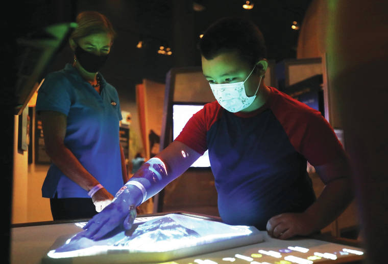 ‘Imiloa docent Lisa Spain helped Kaizen Kami, 7, use a new, interactive map of the Big Island to explore the many weather patterns experienced on the island. Kami stood at the map, which was created by computer science students at the University of Hawaii at Hilo, and talked with Spain for an extended period of time.
