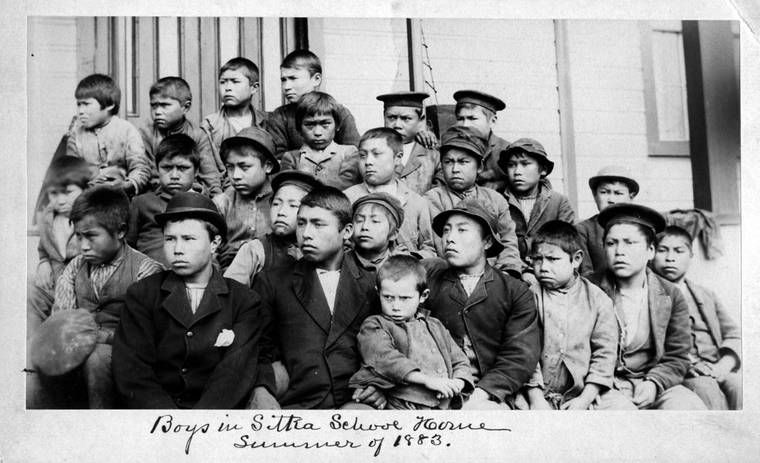 This photo made available by the Presbyterian Historical Society of Philadelphia shows students at a Presbyterian boarding school in Sitka, Alaska in the summer of 1883. (Presbyterian Historical Society, Philadelphia via AP)