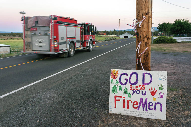 BLY, Ore. — Lower winds and better weather helped crews using bulldozers and helicopters battling the nation’s largest wildfire in southern Oregon, but gusty winds pushed a Northern California wildfire into Nevada on Thursday, prompting evacuations as blazes burn across the West.