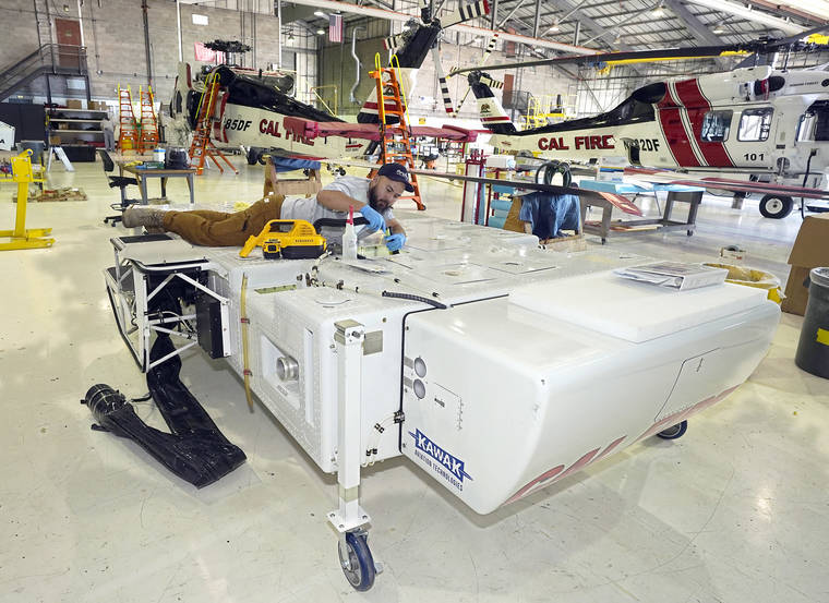 Prince Estrada inspects a tank Friday that carries fire retardant on the Sikorsky Firehawk, in background, at the California Department of Forestry and Fire Protection, at the CDF's Sacramento Aviation Management Unit based at McClellan Airpark in Sacramento, Calif. (AP Photo/Rich Pedroncelli))