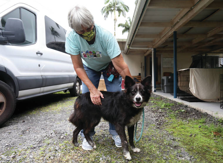 Kelsey Walling/Tribune-Herald Volunteer Beth Evesong pets Rex after his arrival at the Hawaii Island Humane Society shelter in Keaau from Rainbow Friends Animal Sanctuary on Thursday.