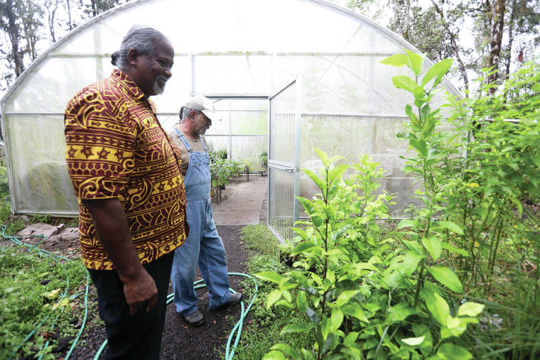 Kelsey Walling/Tribune-Herald Romeo Garcia, left, and Danny McDaniel look at citrus plants while walking through Connections' property in the Kaumana community of Hilo last week.