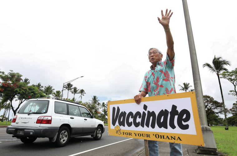 Kelsey Walling/Tribune-Herald Former mayor Harry Kim waves at cars while holding a sign asking passersby to get vaccinated in front of the King Kamehameha I statue in Hilo on Monday. Kim decided to sign wave after seeing COVID-19 cases continually spike in the county. "It's getting bad around here, so I thought I'd come out with a message," Kim said. "When you've lived here a long time, you know when it's time to get out and try to take care of the community."