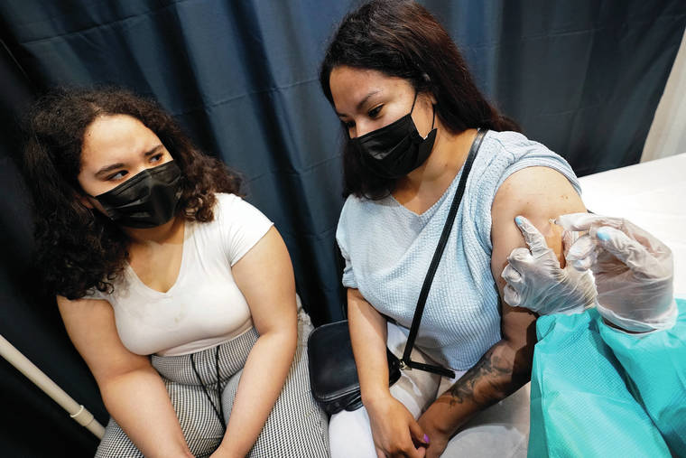 A health care worker inoculates Evelyn Pereira, right, of Brooklyn, with the first dose of the Pfizer COVID-19 vaccine as her daughter Soile Reyes, 12, looks on, Thursday at the American Museum of Natural History in New York. (AP Photo/Mary Altaffer, File)