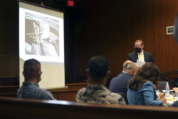Prosecutor Christopher Van Marter introduces evidence in Judge William M. Domingo courtroom during the third day of preliminary hearings for three Honolulu police officers in the killing of Iremamber Sykap, Wednesday, July 28, 2021 in Honolulu. Portions of Honolulu police body camera videos were shown in court Wednesday during an ongoing hearing to determine whether there’s probable cause to support murder and attempted murder charges against three officers in the shooting death of a 16-year-old Micronesian boy. (Cory Lum/Honolulu Civil Beat via AP, Pool)