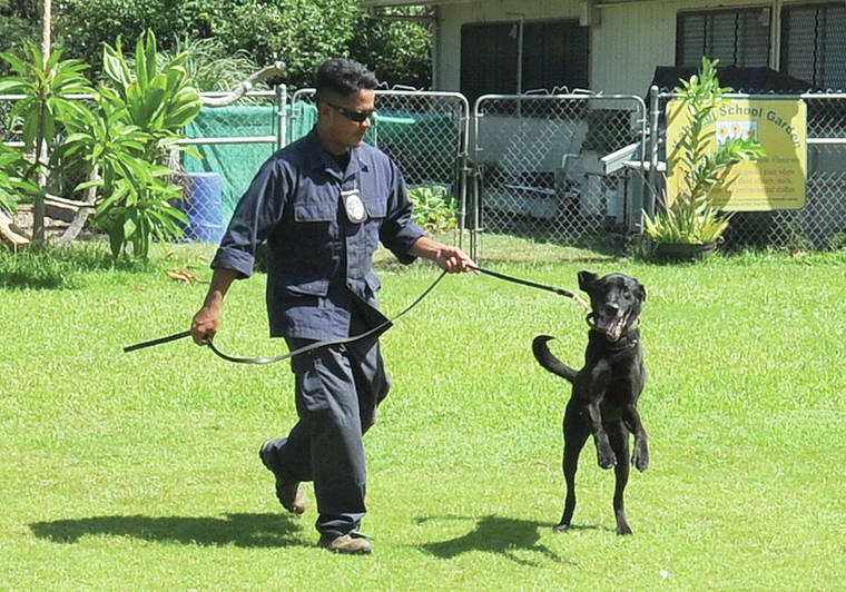 Echo, a 10-year-old black labrador narcotics dog performed his last demonstration Thursday for a group of enthralled keiki at Kahakai Elementary School with his handler, Officer Justin Gaspar. Four boxes were placed on the ground with one containing drugs. After correctly identifying the correct box, the energetic canine jumped to retrieve his reward, a tennis ball, to the delight of the kids.
