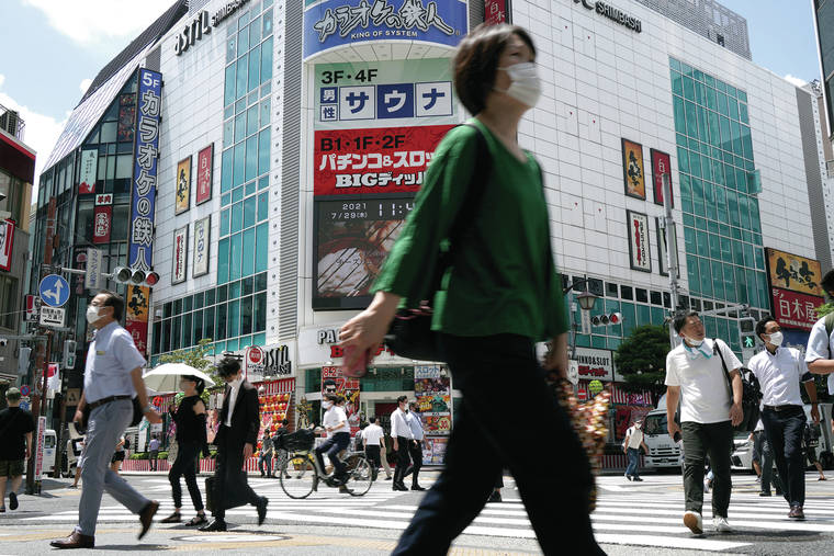 People walk over a crossing near Shimbashi Station in Tokyo Thursday, a day after record-high coronavirus cases were found in the Olympics host city. (AP Photo/Kantaro Komiya)