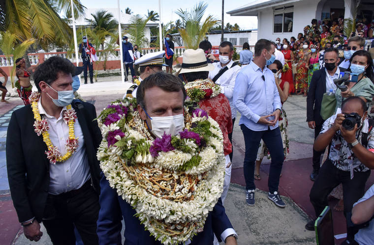 France's President Emmanuel Macron wears leis as he arrives Monday at the Manihi Atoll, 312 miles north east of Tahiti. On Friday, The Associated Press reported on stories circulating online incorrectly claiming a video shows Macron becoming a “human wreath” during his official welcome to French Polynesia, when in fact the video was manipulated to add additional leis. (AP Photo/Esther Cuneo, File)