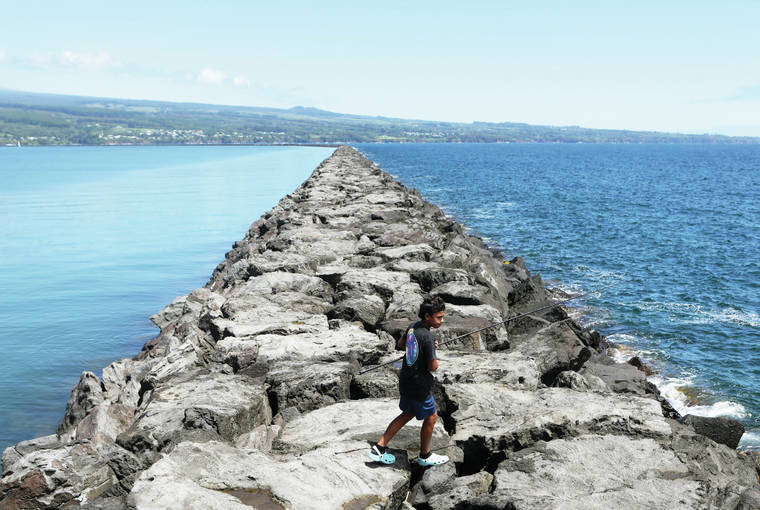 Kelsey Walling/Tribune-Herald Ka‘ale, whose father declined to give his last name, walks across the Hilo breakwater while fishing with his father and brother on Friday.