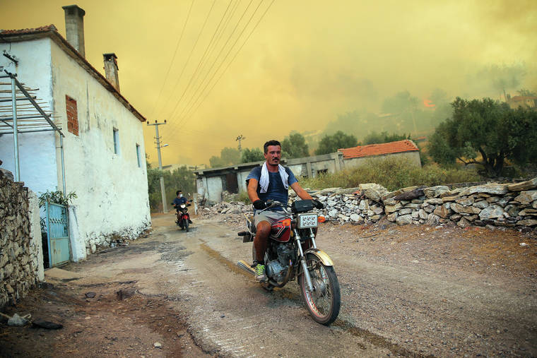 BOZALAN, Turkey — Selcuk Sanli set his two cows loose, put his family’s most treasured belongings in a car and fled his home as a wildfire approached his village near Turkey’s beach resort of Bodrum, one of thousands fleeing flames that have coated the skies with a thick yellow haze.
