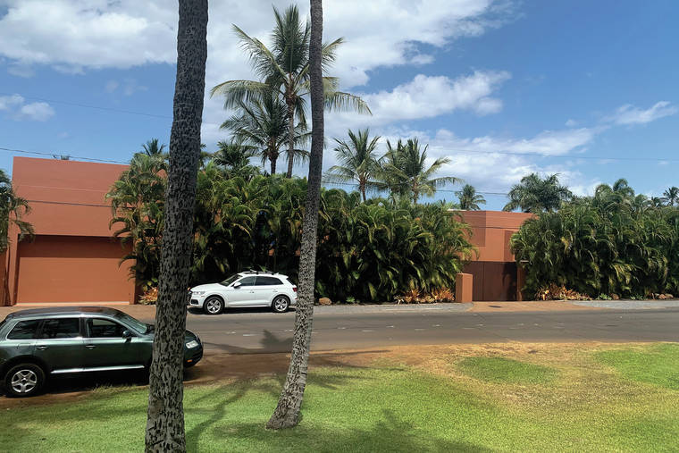 Part of a mansion is shown from a street in Kihei, Maui on Thursday. The $45-million cash sale of the eight-bedroom house reflects a hot real estate market where the median price of a Maui home topped $1.1 million in June. (J.D. Kim via AP)