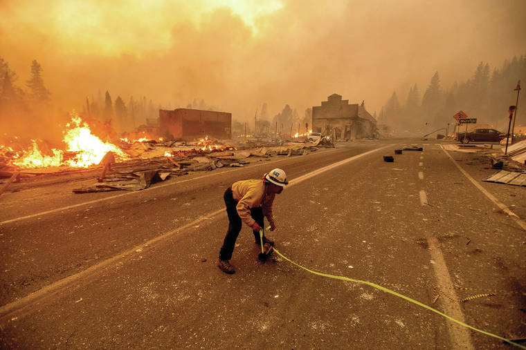 Battalion Chief Sergio Mora marks a road hazard Wednesday as the Dixie Fire tears through the Greenville community of Plumas County, Calif. The fire leveled multiple historic buildings and dozens of homes in central Greenville. (AP Photo/Noah Berger)