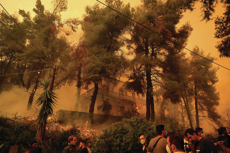 PEFKI, Greece — Pillars of billowing smoke and ash turned the sky orange and blocked out the sun above Greece’s second-largest island Sunday as a days-old wildfire devoured pristine forests and encroached on villages, triggering more evacuation alerts.
