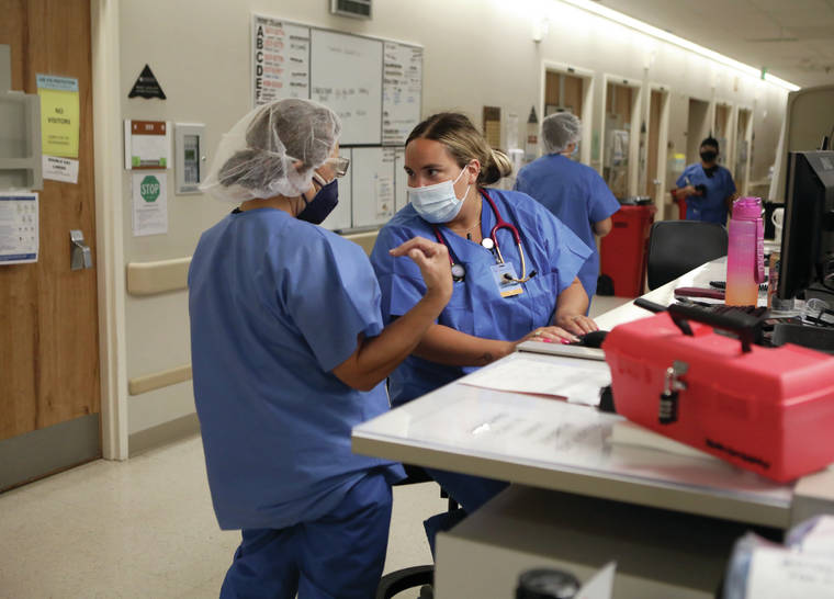 Kelsey Walling/Tribune-Herald Christina Perez, right, speaks with another COVID-19 nurse while working Tuesday on patient paperwork in the COVID-19 unit at Hilo Medical Center.