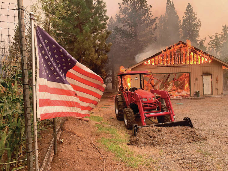 A red tractor is left behind as a home burns Friday outside of Taylorsville in Plumas County, Calif., that was impacted by the Dixie Fire. (AP Photo/Eugene Garcia)