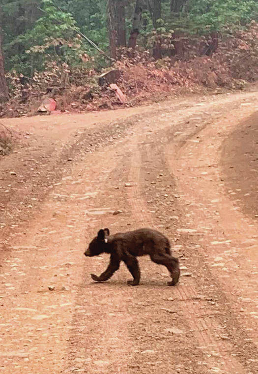 An orphaned bear cub struggles to survive Sunday as it walks alone along a mountain road impacted by the Dixie Fire in Plumas County, Calif. (AP Photo/Eugene Garcia)