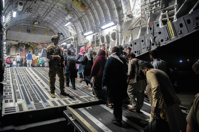 In this Aug. 22 photo provided by the U.S. Air Force, Afghan passengers board a U.S. Air Force C-17 Globemaster III during the Afghanistan evacuation at Hamid Karzai International Airport in Kabul, Afghanistan. (MSgt. Donald R. Allen/U.S. Air Force via AP)