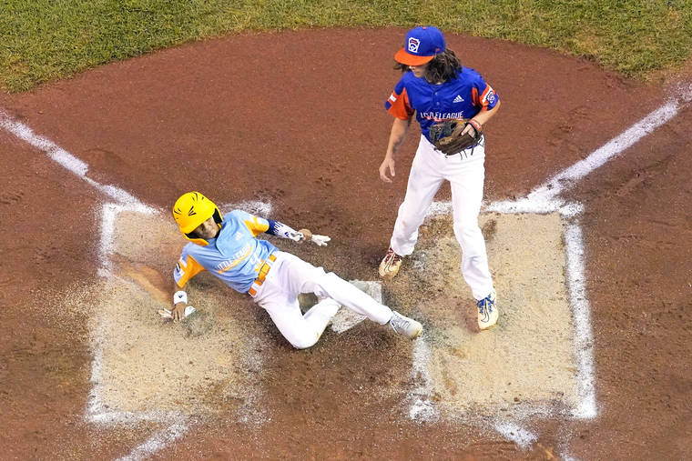 Associated Press Honolulu’s Kaikea Patoc-Young scores on a wild pitch Wednesday by Taylor, Mich.’s Ethan Van Belle during the first inning of Hawaii’s 2-0 win. The team will meet again at 9:30 a.m. Saturday on ABC for a berth in Little League World Series title game.